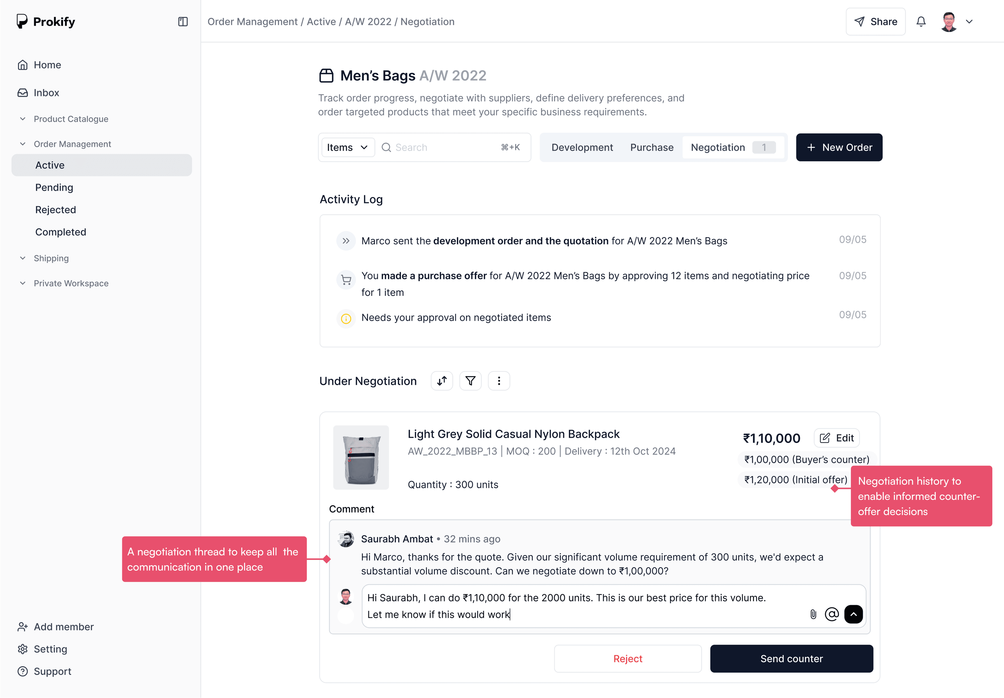 This is a workflow optimization solution for Pantaloons, a high-volume retail company involving Assistant Buyers, Senior Buyers, VP of Buying and their network of 100s of Domestic and International Vendors. The feature introduced negotiation threads and status tracking to improve communication, transparency and decision-making speed.